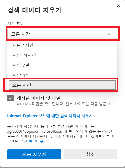 3. "쿠키 및 기타 사이트 데이터", "캐시된 이미지 및 파일" 체크 후 삭제